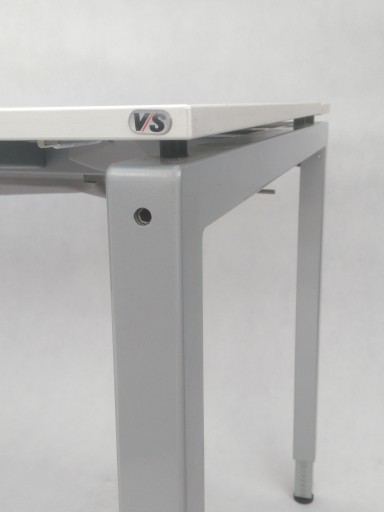 Biurko niemieckiej firmy VS to połączenie prostego designu i wysokiej jakości materiałów. Blat składa się z trzech elementów - głównej płyty i dwóch mniejszych, otwieranych. Zastosowane rozwiązanie umożliwia wygodne ułożenie przewodów. Specjalna maskownica w formie szczotek pozwala na wyciągnięcie kabli w dowolnym miejscu. Pod blatem znajduje się materiałowy uchwyt,prowadnica na kable, dzięki czemu zachowanie porządku jest znacznie łatwiejsze. Biurko wyposażone zostało w nogi wkręcane w metalowy stelaż, posiadające możliwość regulacji aby zapewnić pełną stabilność mebla. Wysokość biurka jest regulowana, co pozwala na wygodną pracę zarówno niskim, jak i wysokim osobom.