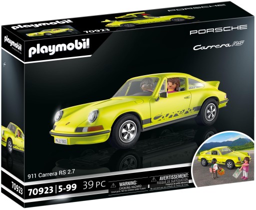 Zestaw do zabawy zawiera Porsche 911 Carrera RS 2.7 firmy PLAYMOBIL w eleganckim odcieniu żółci ze zdejmowanym dachem i otwieraną maską, dwie figurki PLAYMOBIL z koszem piknikowym, kocem i mapą drogową oraz inne dodatki zapewniające niezapomniane wycieczki. Najważniejsze dane samochodu sportowego są wymienione na dołączonej tabliczce prezentacyjnej.