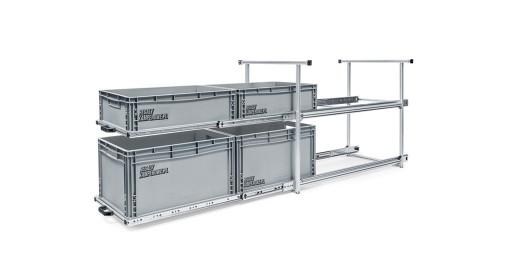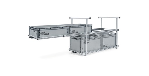 Pudełka EuroBox (nie objęte zakresem dostawy) zatrzaskują się na półce i dzięki temu są automatycznie zabezpieczane podczas podróży.