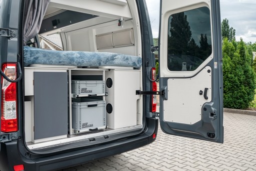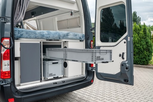 Szuflady można zamocować na dowolnej wysokości tworząc indywidualny regał, dostosowany do potrzeb tylnego garażu Twojego kampera lub Camper Vana