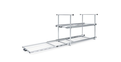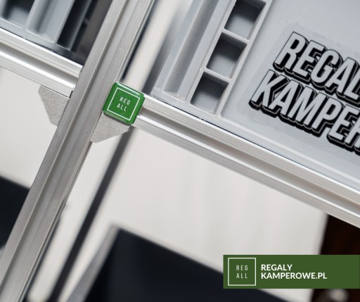 Regał mocowany jest między podłogą, a sufitem garażu kampera lub między ściankami bocznymi camper vana - montaż nie wymaga wiercenia lub wkrętów.
