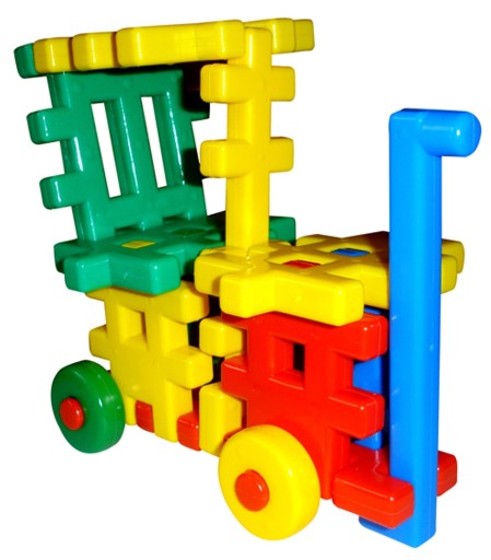 - Zestaw konstrukcyjny /80 elementów/ zawiera łatwe w montażu klocki-wafle różnych kształtów, kółka, choinki, zwierzęta domowe, safari... etc..