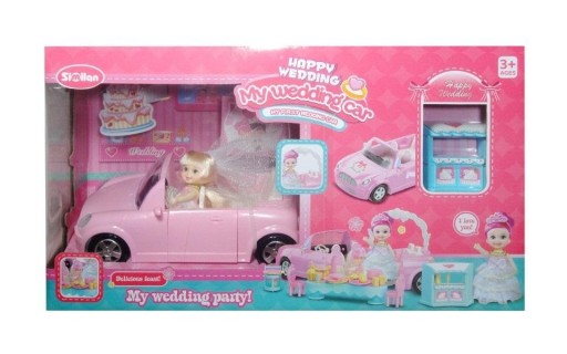 Plastikowe auto bez dachu z uroczą laleczką w sukni ślubnej w środku. Samochód można rozłożyć i urządzić przyjęcie ponieważ w zestawie znajdują się takie akcesoria jak: stół, tort, prezenty, krzesła, sztućce. Produkt zapakowany w kartonowe opakowanie.