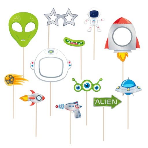 - W zestawie: 12 rekwizytów (głowa kosmity, głowa kosmonauty, rakieta duża i mała, pojazd kosmiczny, okulary w kszt.ałcie gwiazdek, oczy kosmity, kosmonauta, broń laserowa, paszcza kosmity, meteoryt), 12 drewnianych patyczków i 12 pasków taśmy klejącej