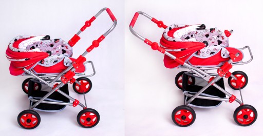 Budka zamocowana jest na mechanizmie grzechotko-wym,dzięki czemu płynnie można regulować jej ustawienie.Spacerówka posiada regulowane ustawienie oparcia i podnóżka.Wózek ma bardzo solidną metalową konstrukcję.Do nosidła zmieści się lalka o wysokości 55cm .Produkt polski świetna jakość