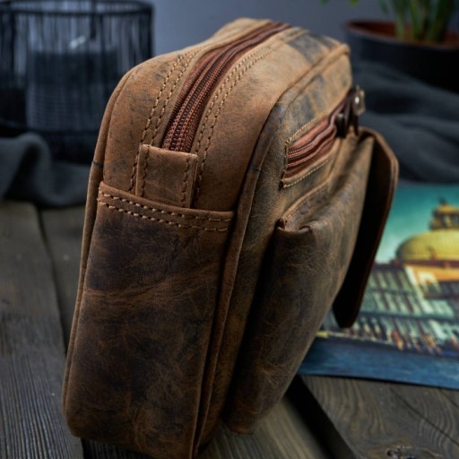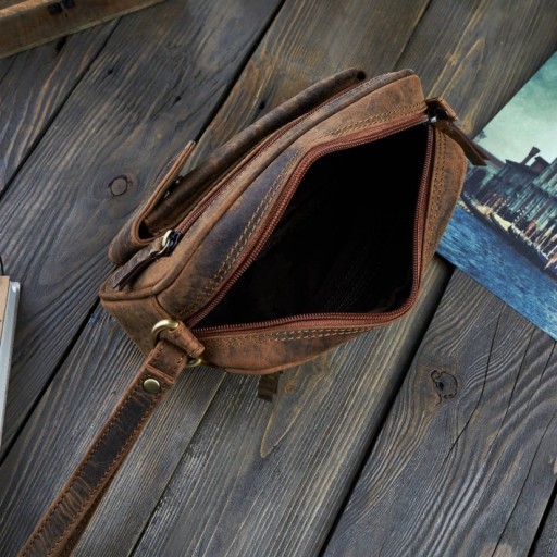 Saszetka do ręki T-56 to klasyczny model stworzony z myślą o miłośnikach stylu vintage. Mężczyźni poszukujący poręcznych i praktycznych dodatków galanteryjnych również będą nim zachwyceni. Saszetka jest wykonana ze skóry naturalnej hunter, która patynuje się i nabiera indywidualnego charakteru wraz z latami użytkowania. Komora główna jest zapinana na suwak, w jej wnętrzu znajduje się zapinana kieszonka. Z tyłu oraz z przodu również umieszczono kieszenie na suwak po długości. Dodatkowe miejsce do przechowywania stanowi kieszeń frontowa, zapinana na napę. Możesz z powodzeniem schować w niej telefon lub klucze. To również doskonałe miejsce na długopis czy chusteczki. Saszetka posiada skórzany pasek, dzięki któremu możesz komfortowo nosić to akcesorium.