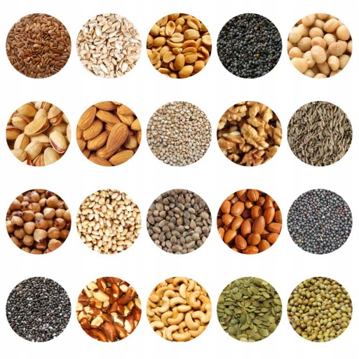 Orzechy: migdał, brazylia, orzechy nerkowca, orzechy laskowe, macadamia, orzeszki ziemne, pinenut, pistacje, orzech