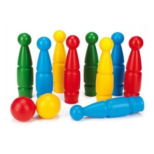Zestaw składa się z 9 kolorowych kręgli i 2 kul. Kręgle są doskonałą formą spędzania wolnego czasu dla dziecka, ponieważ można grać w nie w pojedynkę lub w grupie, rozwijając przy tym zdolności manualne oraz precyzję.