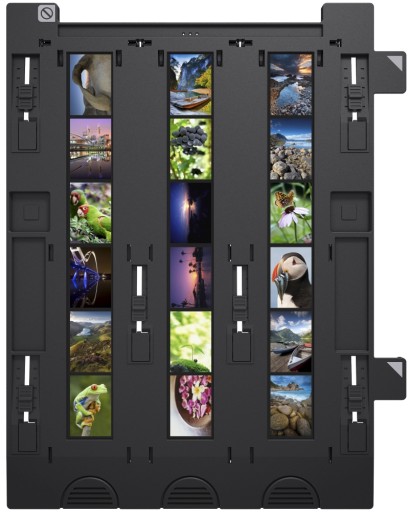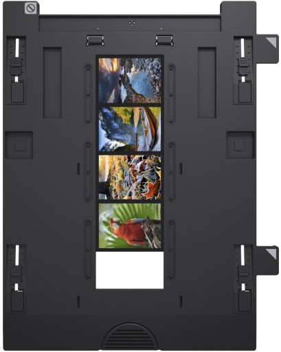 Dzięki udoskonalonym uchwytom klisz z funkcją regulacji wysokości i sztywnej konstrukcji możesz skanować klisze w szerokiej gamie formatów. V850 Pro obsługuje także formaty klisz do 8 x 10 cali, umieszczane bezpośrednio na szybie skanera.