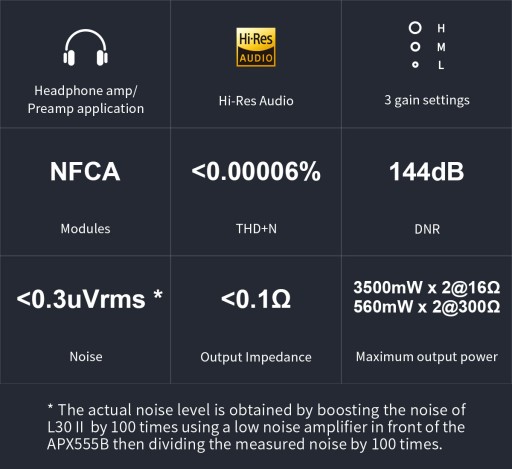 Topping L30 II wykorzystuje poprawiony moduł wzmacniacza NFCA (Nested Feedback Composite Amplifier). Pozwala on podwoić moc wyjściową (w porównaniu z L30) dostępną poniżej 300 Ohm. Moc wyjściowa, która umożliwia L30 II towarzyszyć większości słuchawek na rynku, w tym najbardziej wymagającym modelom o wysokiej impedancji. Nowy obwód oferuje również bardzo niski poziom szumów mierzony na poziomie 0.3 µV, zakres dynamiki 144 dB oraz THD+N na poziomie 0,00006%.