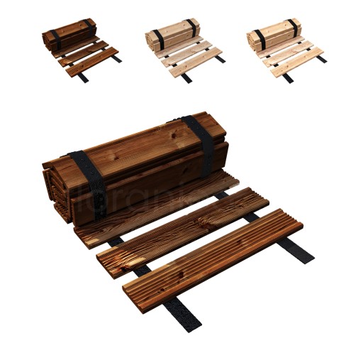 Impregnowane lub surowe drewno modrzewiowe. Rozwijana ścieżka do ogrodu, tarasu, skracany chodnik drewniany. Marka: Floranica.