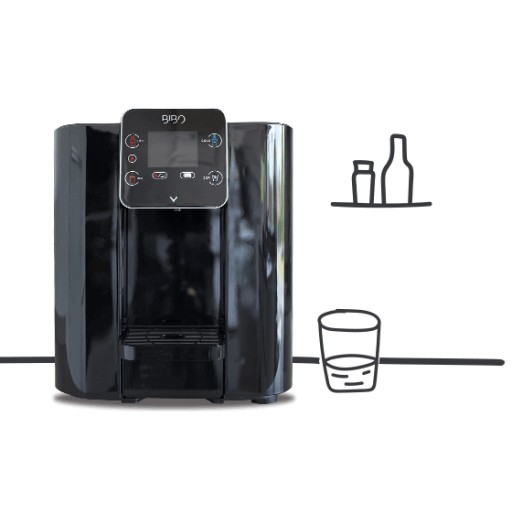 BIBO nie wymaga ręcznego napełniania, ponieważ podłącza się go do go sieci wodociągowej. BIBO stanowi przystępną cenowo alternatywę dla drogich podblatowych systemów filtrowania gorącej i schłodzonej wody kranowej.