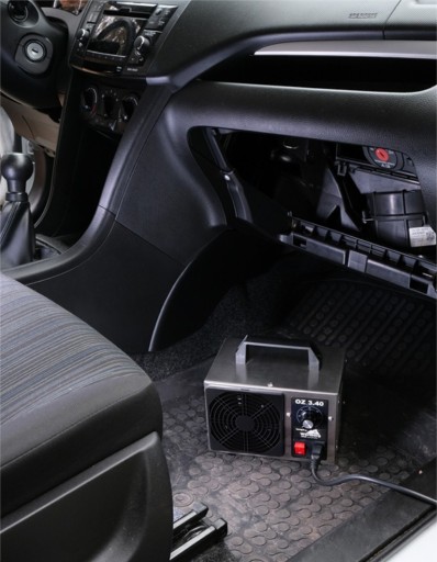 - urządzenie umieścić i skierować wylotem w miejsce poboru powietrza obiegu wewnętrznego auta – zwykle optymalną lokalizacją jest podłoga przed fotelem pasażera, wylotem w stronę skrytki (najlepiej na czas ozonowania pozostawić ją otwartą i wyjąć przeciwpyłkowy filtr kabinowy)