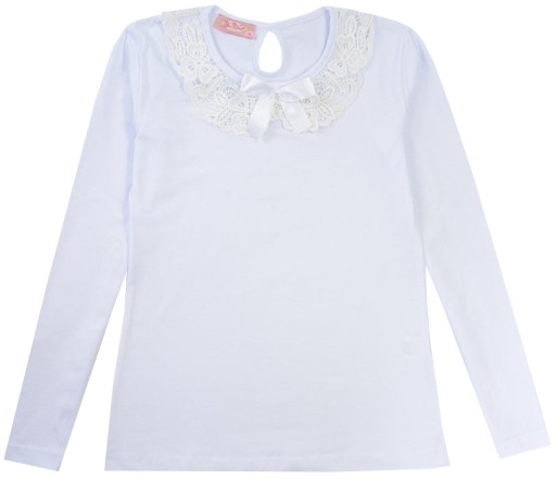 Krój: elegancka bluzeczka z koronkowym kołnierzykiem i kokardką przy szyi. Na karku łezka.