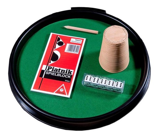 Efektowny zestaw do gry w kości oczkowe składający się z tacki, kubka, ołówka, bloczka do zapisu i 5 kostek. Dołączona instrukcja w języku polskim.
