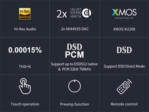 - Obsługiwane częstotliwości próbkowania: Wyjście USB : PCM do 32bit 768kHz, natywny DSD do DSD512, DSD DoP do DSD256 / Wyjście optyczne/coaxialne: PCM do 24bit 192kHz
