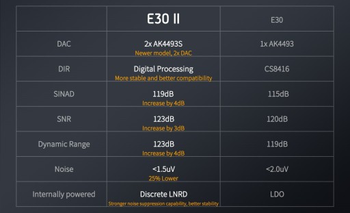 Głównym ulepszeniem E30 II jest stopień konwersji cyfrowo-analogowej. Wykorzystuje teraz dwa układy DAC AKM AK4493S połączone równolegle, każdy dedykowany do oddzielnego kanału, dzięki czemu oferuje znacznie lepszą wydajność. Te chipy są same w sobie ulepszeniami układu AK4493. Korzystają również z zastrzeżonej technologii Velvet Sound i zapewniają reprodukcję dźwięku, która jest zarówno precyzyjna, jak i detaliczna.
