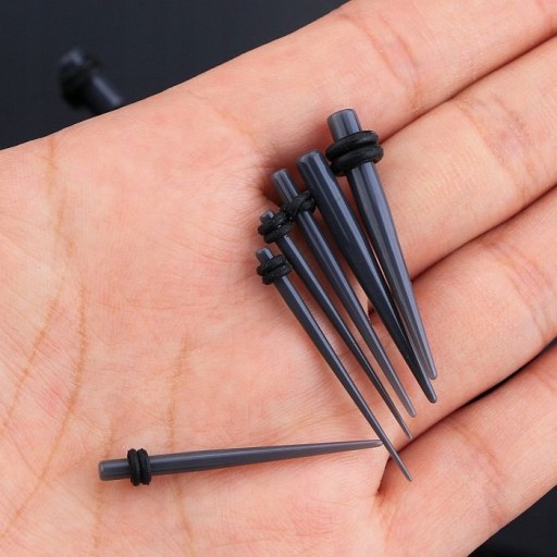 5. 18 sztuk akrylowych rozpychaczy z podwójnymi pierścieniami o-ring – 14G (1,6 mm), 12G (2 mm), 10G (2,5 mm), 8G (3 mm), 6G (4 mm), 4G (5 mm), 2G (6 mm), 0G (8 mm), 00G (10 mm).
