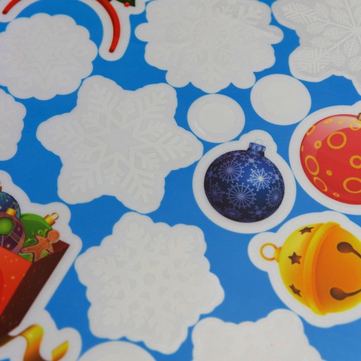 Na naszej aukcji dostępne jest 8 dużych arkuszy A4 wypełnionych po brzegi naklejkami. Znajdują się na nich kolorowe naklejki z motywami świątecznymi – choinkami, cukierkami, Świętym Mikołajem, reniferem, bombkami, śnieżynkami, choinką. Można z nich ułożyć na oknach wyjątkowe historie. Naklejki widać doskonale z obu stron. Przed naklejeniem należy dokładnie odtłuścić szyby.