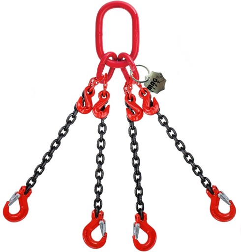 Zawiesie łańcuchowe 4-cięgnowe z ogniwem zbiorczym wraz z hakami skracającymi zakończone hakami z zapadką DOR: 4,25T/4 250KG - do zawiesia dołączona jest szekla - DOR: 4,75 tony.