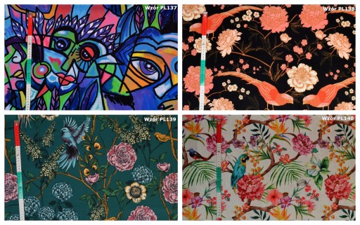 - Materiał wykończenia abażuru (strona wewnętrzna): wysokogatunkowy welur drukowany (oprócz wzór PL 124 – bawełna)
