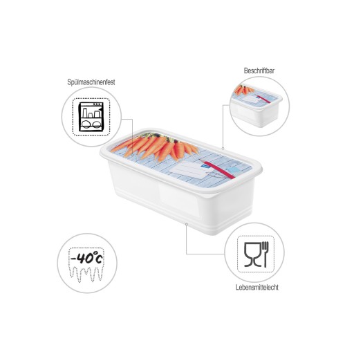 Zestaw 3 pojemników do zamrażania DOMINO o pojemności 1,2 l to idealne rozwiązanie do zamrażania różnorodnej żywności. Na przykład, jeśli masz świeżo zebrane warzywa lub owoce, zalecamy zamrożenie ich. Dzięki temu zachowasz ich świeżość, a nawet po kilku tygodniach jedzenie będzie smakować tak, jakby było świeżo zebrane. Ten zestaw pojemników jest również idealny do zamrażania kompletnych dań lub posiłków. Dzięki temu możesz szybko i łatwo przygotować jedzenie z wyprzedzeniem lub dla dzieci na cały tydzień. Pojemniki DOMINO można przechowywać w sposób oszczędzający miejsce, ponieważ można je umieszczać jeden w drugim. Oprócz tego zestawu 3 pojemników o pojemności 1,2 l, w ofercie firmy Rotho dostępne są również inne rozmiary pojemników, aby każde gospodarstwo domowe mogło znaleźć odpowiedni zestaw.