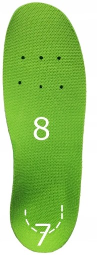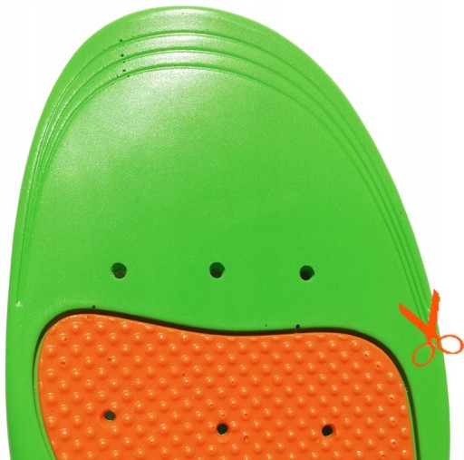 - Wkładki posiadają zakres rozmiaru. Przytnij wkładkę po specjalnych liniach pomocniczych, które są wytłoczone na wkładce aby dopasować wkładkę do swojej stopy