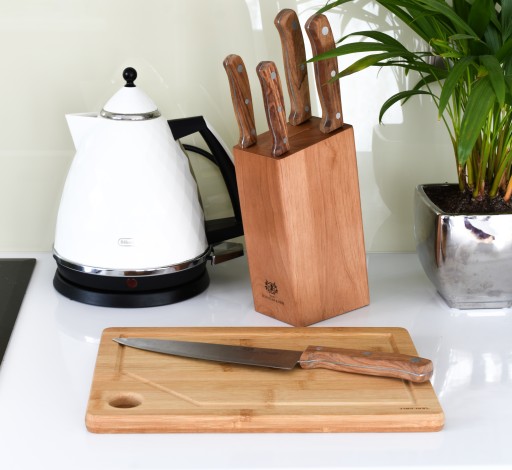Komplet dostępny jest w nowoczesnym, bloku z drewna bukowego.