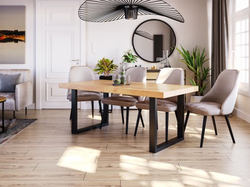 Rozkładany stół na metalowych nogach i blatem z płyty laminowanej. Takie połączenie tworzy solidny i stylowy stół do kuchni lub jadalni.