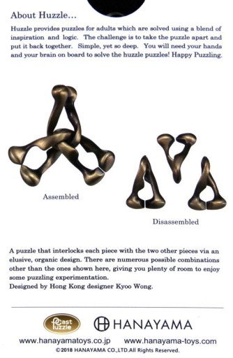 Seria "Huzzle" to łamigłówki dla dorosłych, które wyróżniają się trzema wyjątkowymi elementami: innowacyjnymi pomysłami, bardzo wysoką jakością wykonania oraz unikalnym designem. Zagadki oparte są na koncepcji dwóch prostych pytań: czy możesz rozdzielić elementy? czy możesz złożyć je ponownie razem? Wszystkie wzory zmuszają do myślenia i uwolnienia twórczej wyobraźni, a każde rozwiązanie to umiejętne połączenie pracy intelektu i... obu rąk. Czasami będzie ono trudne i pokrętne, czasami łatwe i przyjemne.