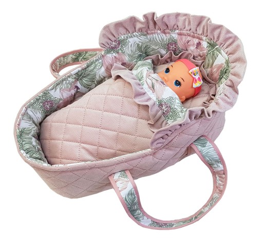 Oferujemy Państwu starannie wykonane nosidełko z pościelą dla lalki. W bardzo modnym kolorze: magnolie + róż. Nadaje się dla lalek do 38 cm długości.