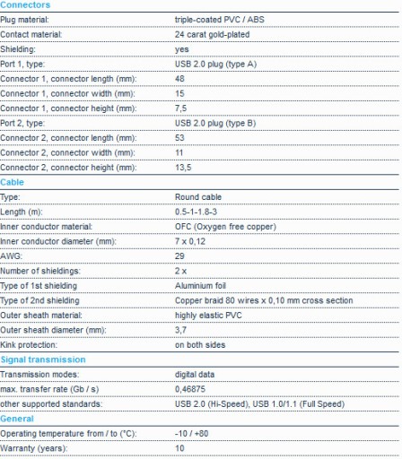 Przesyłaj dane z przenośnych dysków twardych, skanera, drukarki czy innych urządzeń peryferyjnych. USB 2.0 umożliwia transmisję danych z prędkością do 480 Mb na sekundę i jest uznanym złączem od wielu lat. Dzięki podwójnemu ekranowaniu sygnału, czystym materiałom i precyzyjnemu wykonaniu kabel ten doskonale przesyła dane bez żadnych strat na jakości.