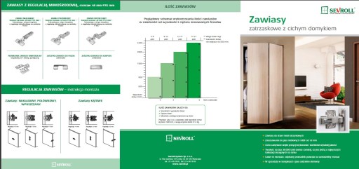 Cichy domyk to opcja podnosząca komfort użytkowania mebli. Zastosowanie zawiasów zatrzaskowych z cichym domykiem sprawia, że drzwi nie wymagają już konieczności asekurowania przed głośnym trzaskaniem. System buforu dociągu obejmuje końcową fazę otwarcia – osłabiony dociąg w fazie pełnego otwarcia zapobiega uderzaniu lekkich frontów. Pełną ofertę zawiasów stanowią standardowe zawiasy z prowadnikiem mocowanym na 4 wkręty, co pozwala montować duże i ciężkie fronty. Ofertę uzupełniają rozwiązania z prowadnikiem na eurowkręty oraz zawiasy z regulacją mimośrodową, pozwalającą na łatwiejszą i dokładniejszą regulację. Sevroll zawsze stawia na jakość wykonania oraz sprawdzone materiały, dlatego zawiasy posiadają gwarancję 80 000 cykli otwórz-zamknij. W praktyce zapewnia to wiele lat niezawodnej eksploatacji z zachowaniem pełnych parametrów użytkowych.