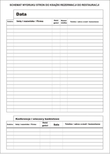 Proponujemy Państwu Książkę Rezerwacji która pomaga przy organizacji i planowaniu, które jak wiemy, jest stałą częścią pracy restauracji. Porządek w rezerwacjach pomaga dbać o najwyższą jakość obsługi klienta. Nasza książka jest formatu A4, zawiera 365 stron użytkowych. Każda strona pozwala na wpisanie daty – zatem nie mamy ograniczeń w ilości rezerwacji w danym dniu. To my decydujemy ile stron przeznaczamy na dany dzień. Ponadto mamy rubryki takie jak: godzina, imię i nazwisko, ilość gości, numer stolika, dane kontaktowe oraz tabelkę odpowiedzialną za konferencje i wieczory bankietowe.