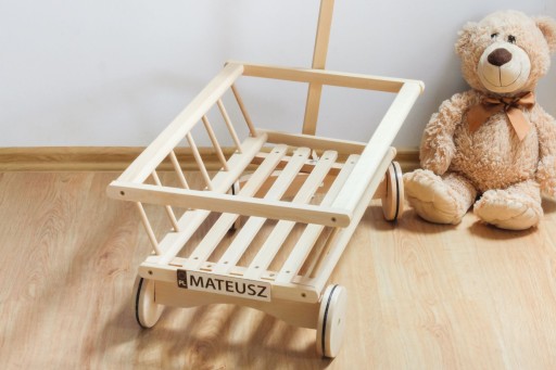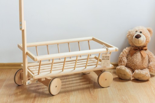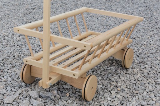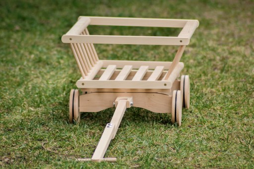 Drewniany, duży wózek o ażurowej konstrukcji burt oraz dna. Koła z antypoślizgowym, gumowym oringiem. Stanie się ozdobą w domu i na podwórku.