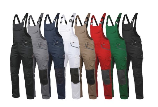 Potrójne szwy, uchwyt ze spinkami na identyfikator, kieszenie kolanowe, certyfikowana zgodność z wymogami DIN EN 14404