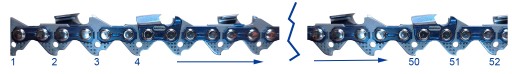 - Ostatnie cyfry w symbolu łańcuchów tnących oznaczają jego długość. Na przykład: 052E / 052X | 056E / 056X | 064E / 064X wskazują łańcuchy o długościach 52 , 56 lub 64 ogniw prowadzących.