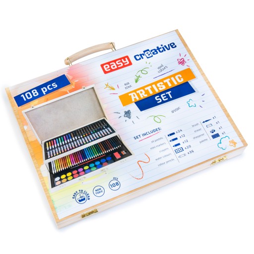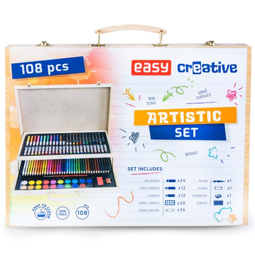 Zestaw składa się z aż 168 elementów, a w jego skład wchodzi 70 kredek, 36 farbek akrylowych , 54 pastele olejne, 4 pędzelki, 2 ołówki HB, temperówka oraz buteleczka. Wysokiej jakości produkty to doskonały początek artystycznej przygody.
