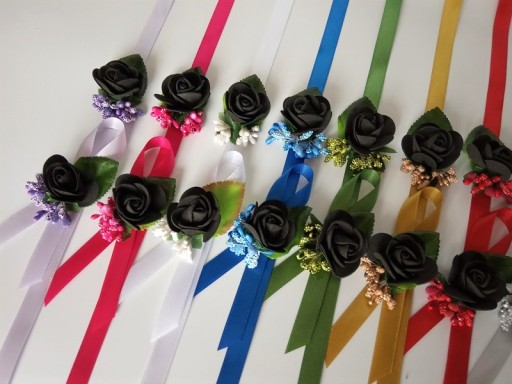 Na innej aukcji dostępne są pasujące do przypinek kotyliony na rękę dla pań.