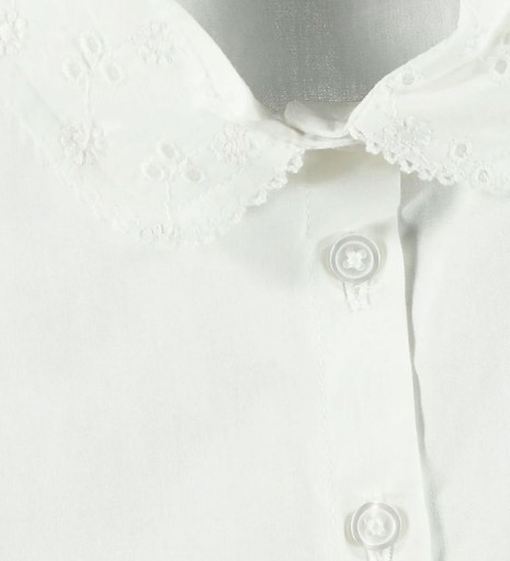 W kolorze białym, z pięknymi haftowanymi kwiatami i falistym brzegiem. Kołnierzyk koszuli Name It ma klasyczne zapięcie przy dekolcie, a z przodu można go zapiąć do końca. Kołnierzyk można nosić pod kardiganem, swetrem lub sukienką, aby wyglądało to tak, jakby dziecko miało pod spodem koszulę, lub można go założyć na inne ubrania jako elegancki detal. U dołu znajdują się regulowane, elastyczne paski po bokach, dzięki czemu idealnie dopasowuje się do ciała.