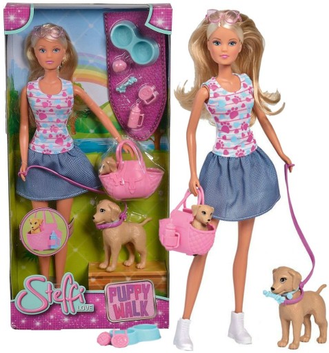 Steffi ma niebieskie oczy i długie blond włosy. Na głowie ma stylowe różowe okulary , a na nogach modne białe trapery. Ubrana jest w piękną bluzeczkę ze wzorem psich łapek i spódniczkę w niebieskim kolorze,co tworzy piękny dziewczęcy zestaw idealny na spacer! Steffi jest w towarzystwie dwóch słodkich psiaków,które są wierną kopią rasy Golden Retriever ( jeden malutki szczeniaczek w różowym koszyczku i drugi większy na pięknej różowej smyczy )