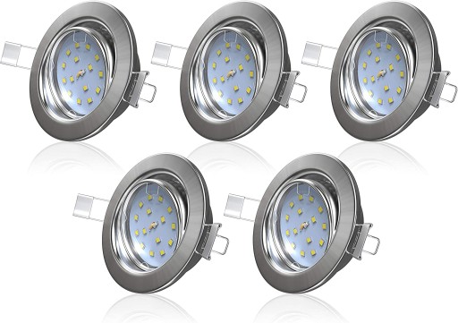 5x Oprawka wpustowa - Downlight - w lampie zastosowana wysokiej jakość moduł LED o mocy 5W i barwie światła ciepłej 3000k dzięki któremu głębokość montażowa zmniejszyła się do zaledwie 3 cm. Moduł LED jest wymienny, można go w każdej chwili zastąpić dowolną żarówką np. z trzonkiem GU10. Oprawka w kolorze nikiel mat.