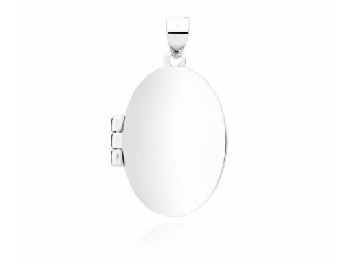 Delikatny wykonany z rodowanego srebra otwierany wisiorek o owalnym kształcie, polerowany na wysoki połysk.