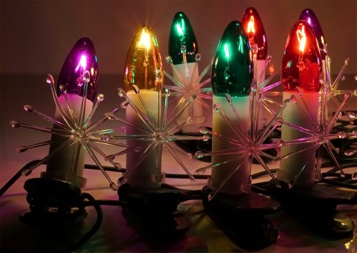 Polskie, klasyczne, tradycyjne lampki choinkowe o kształcie świeczki. Każdemu przypomną święta pachnące pomarańczami i radosny czas zakładowych zabaw i paczek dla najmłodszych