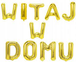 Komplet 10 szt. balonów tworzących napis "WITAJ W DOMU" w kolorze złotym.