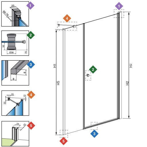 - Zakres regulacji: 985-1010 mm (Dotyczy on możliwości regulacji szerokości kabiny na profilach montażowych.)