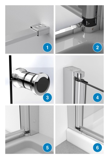 - Nowoczesne zawiasy - nowoczesne zawiasy rurowe z mechanizmem unoszącym drzwi podczas ich otwierania oraz opuszczającym podczas zamykania, zapobiegają niszczeniu uszczelki dolnej i lepiej uszczelniają drzwi podczas korzystania z prysznica.