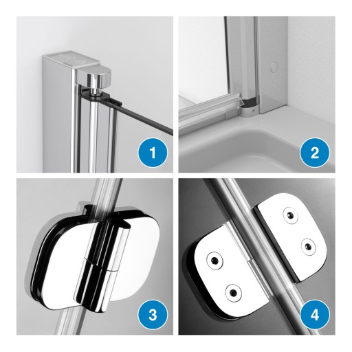 - Nowoczesne zawiasy - rurowe zawiasy z mechanizmem unoszącym skrzydło podczas ich otwierania oraz opuszczającym podczas zamykania, zapobiegają niszczeniu uszczelki dolnej i lepiej uszczelniają parawan podczas korzystania z wanny.