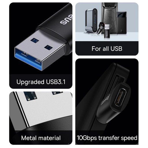 Niewielki adapter USB-A (USB 3.1) do USB-C marki Baseus jest kompatybilny z wieloma różnymi urządzeniami i pozwala przesyłać pliki z prędkością nawet 10 Gbps. Umożliwia też szybkie ładowanie PD (za pomocą odpowiedniego kabla, który należy dokupić oddzielnie).