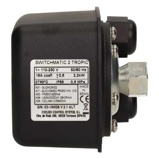 SWITCH - MATIC 2 to elektroniczny łącznik ciśnienia ze zintegrowanym manometrem cyfrowym. kontroluje załączanie i wyłączanie pompy jednofazowej do 2,2kW (3 HP). Ciśnienie załączania i wyłączania mogą być łatwo konfigurowane dzięki prostemu i przyjaznemu panelowi kontrolnemu. Połączenia sa wykonywane identycznie do konwencjonalnego przełącznika elektromechaniczneg